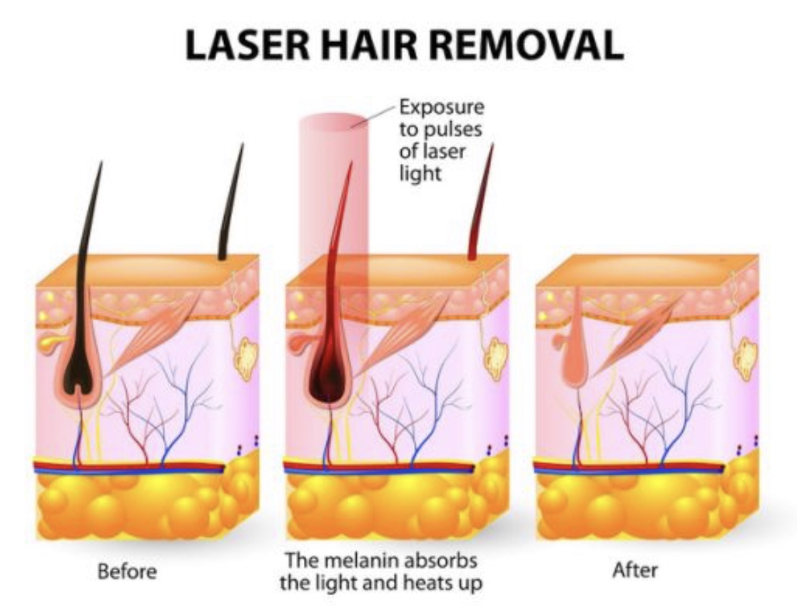 Laser hair removal is not for everyone, and although technology has advanced over the past 10 years it still only works on pigmented hair. So, sorry guys no blondes, grey or red hair. Light brown can be treated however, it may take more sessions to reach a desired result. How the laser works without getting too technical is it targets the melanin (color) in the hair follicle. The more melanin in the hair follicle the better the laser can target the cells around the bulb which leads to killing that follicle all together or reducing it. So we know it targets melanin, that also means how we treat fair skin and dark skin differ dramatically. All skin types can be treated with laser hair removal but the ideal candidate will be light skin and dark hair. This is because darker skin types including olive tones and asian skin have underlying pigment. How the skin reacts to heat can cause damage to the skin resulting in hyperpigmentation (darkening), Hypopigmentation (lightening), blistering, burning, and scarring. Many of which cannot be reversed. This is why it is extremely important to go to an experienced professional who is educated on how the skin reacts. Different skin conditions and medical history is important as well. In our office we use a Diode Laser which is a perfect wavelength to eradicate the hair most effectively and you will find much less painful (I promise much less worse than it was 10 years ago). We can treat all skin types in our office but we treat darker skin with more caution due to the risks involved. Other recommended options for darker skin types would be IPL hair removal or electrolysis. These are safer for dark skin but will require more treatments and less effective in reduction.
