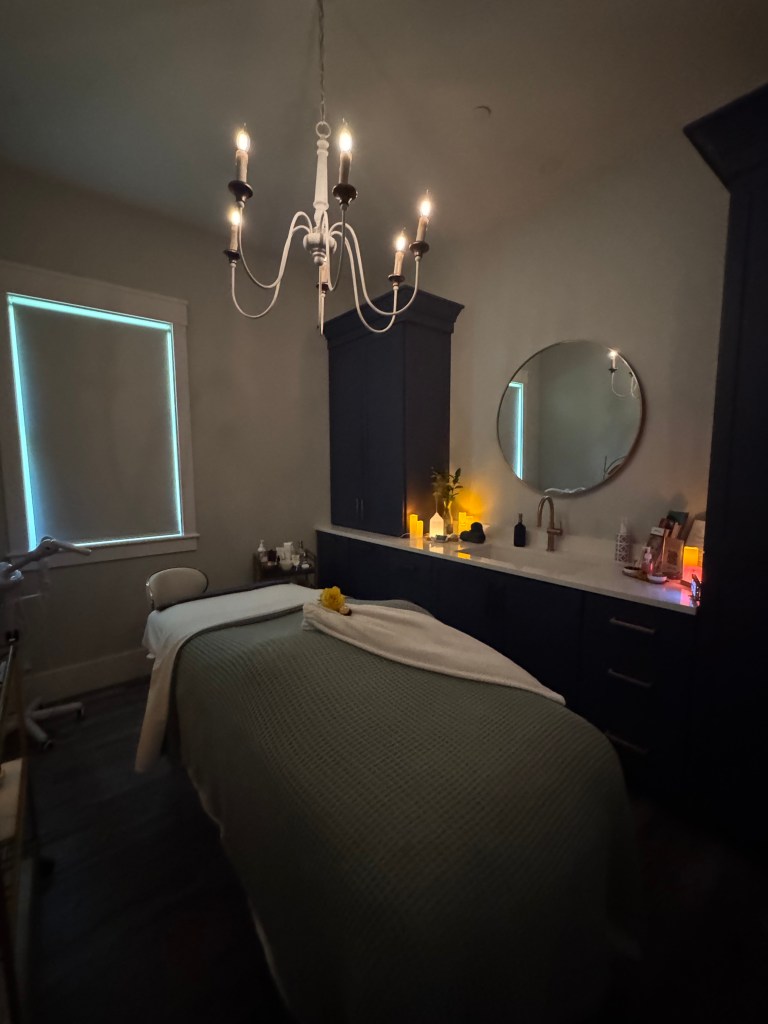 The relaxation lounge was a dream: dimly lit, with a barn door, cozy fireplace, lemon water, tea, and a wide selection of snacks. It’s ideal for a solo escape, a girls’ weekend, or even a bridal party pampering session.