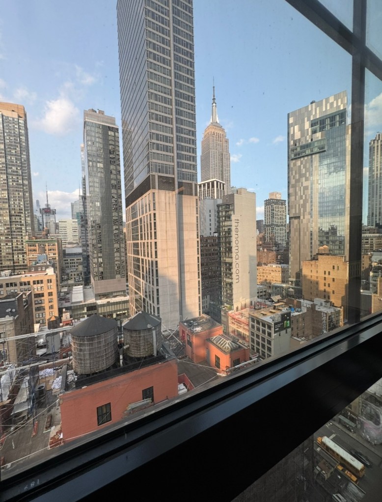 We stayed at the Moxy NYC Chelsea, which had an absolutely insane view of the Empire State Building—a major highlight and such a fun, energetic hotel choice for the trip.